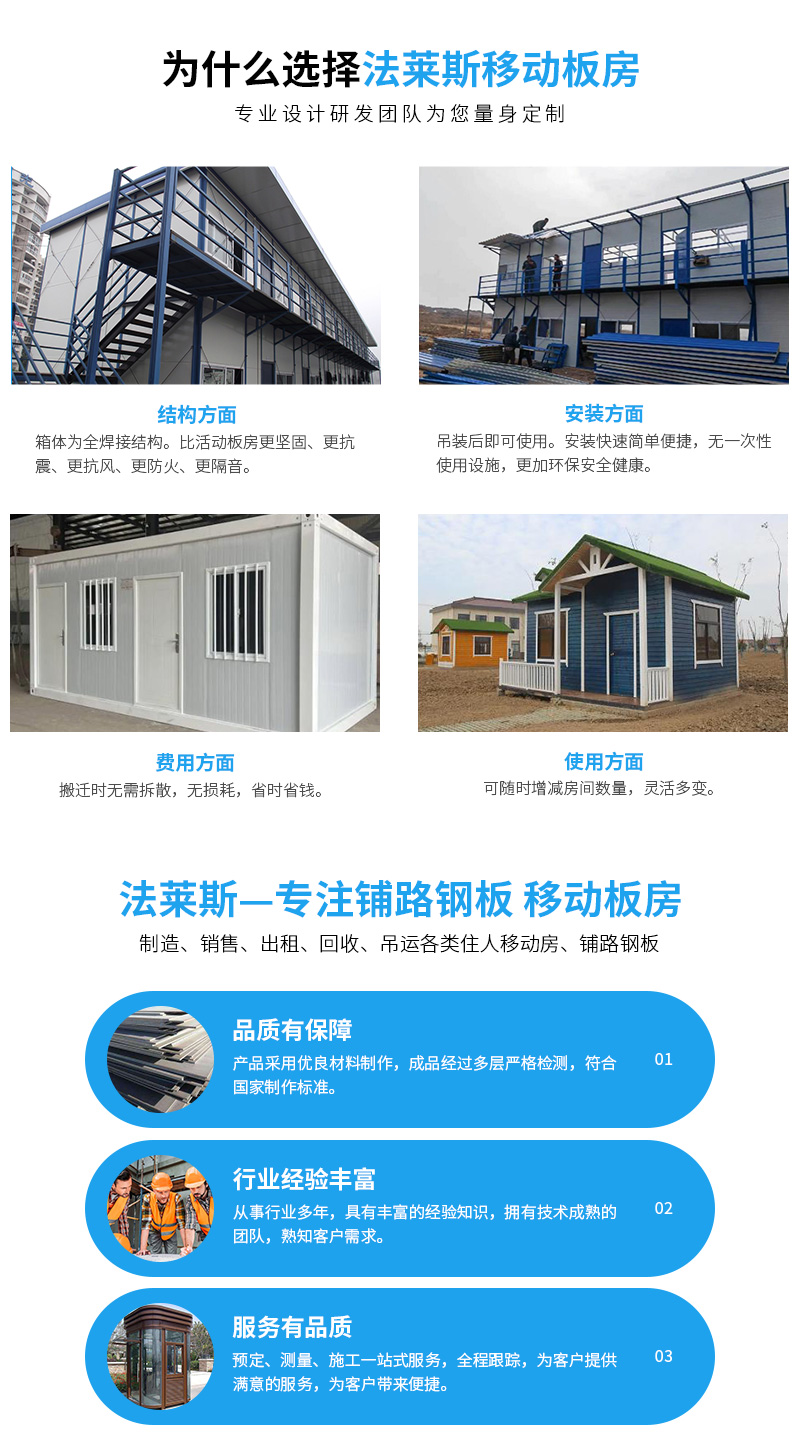 ? 遷運(yùn)方便:整箱運(yùn)輸,現(xiàn)場(chǎng)吊裝,遷運(yùn)周期更短,當(dāng)天即可入住。